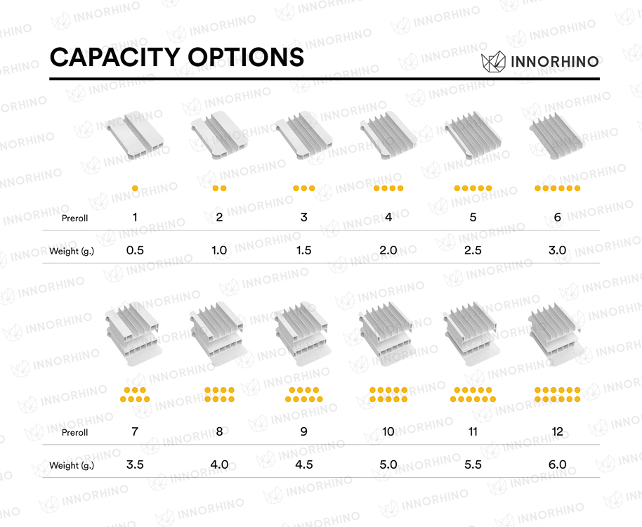The default capacity is for 7 mini prerolls (1/8th oz or 3.5g). Yet, our adjustable paper insert can hold from 1 up to 12 prerolls in one pack. The insert can also be removed entirely, making the case suitable for gums, mints, or other edibles.